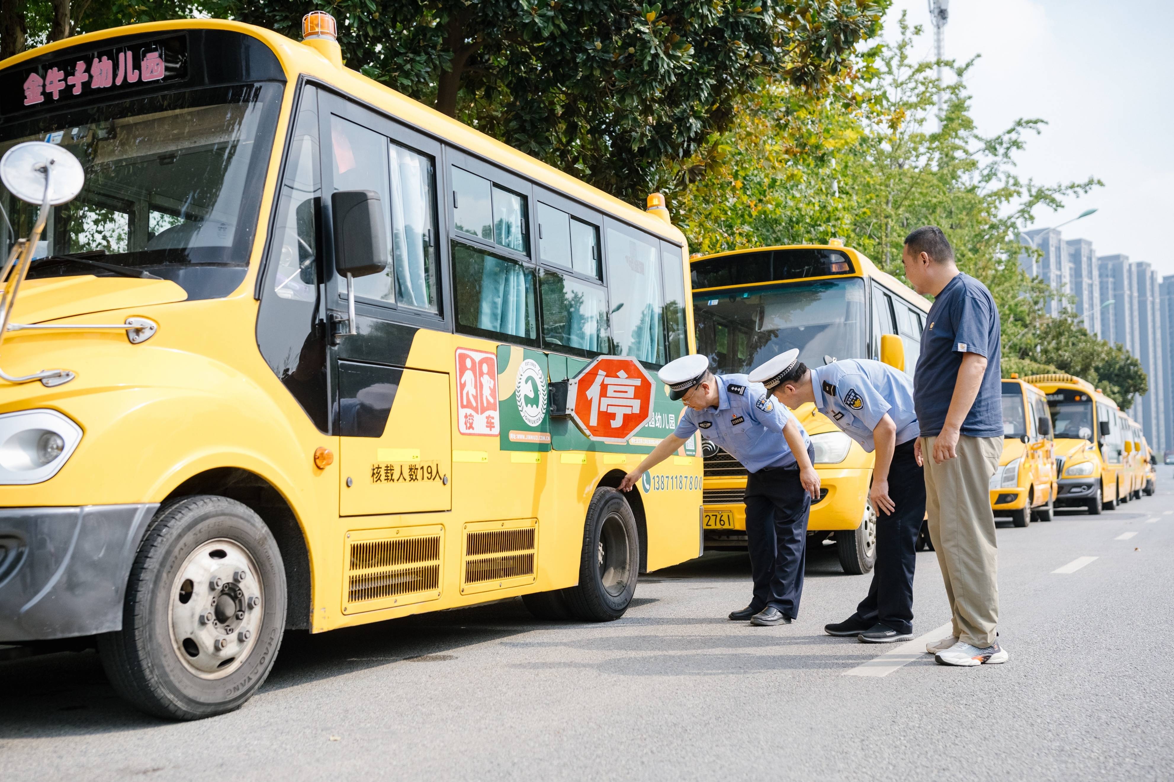 早在 8 月底,江岸交警便提前与辖区学校对接,摸清新建校区出行需求、梳理老校区交通痛点,用半个多月的时间逐项解决问题。针对学生乘车安全,交警三中队于 8 月 25 日启动校车专项检查,中队长周凯手持记录表,带领民警对每辆校车进行 “全身体检”。 民警龚铁军重点检查校车标志灯、停车指示牌完好度,打开应急门确认通道畅通,逐件核对应急锤、灭火器、急救箱的配备情况与有效期:“这些都是突发情况下的‘救命工具’,一点都不能马虎。” 民警魏东则俯身查看轮胎磨损程度,调试灯光照射角度,确保车辆核心部件处于最佳安全状态。此外,专班还通过后台系统核查校车驾驶人交通违法记录、交通事故史,对发现的隐患当场下达《责令整改通知书》,明确 “整改不到位一律禁止上路”。